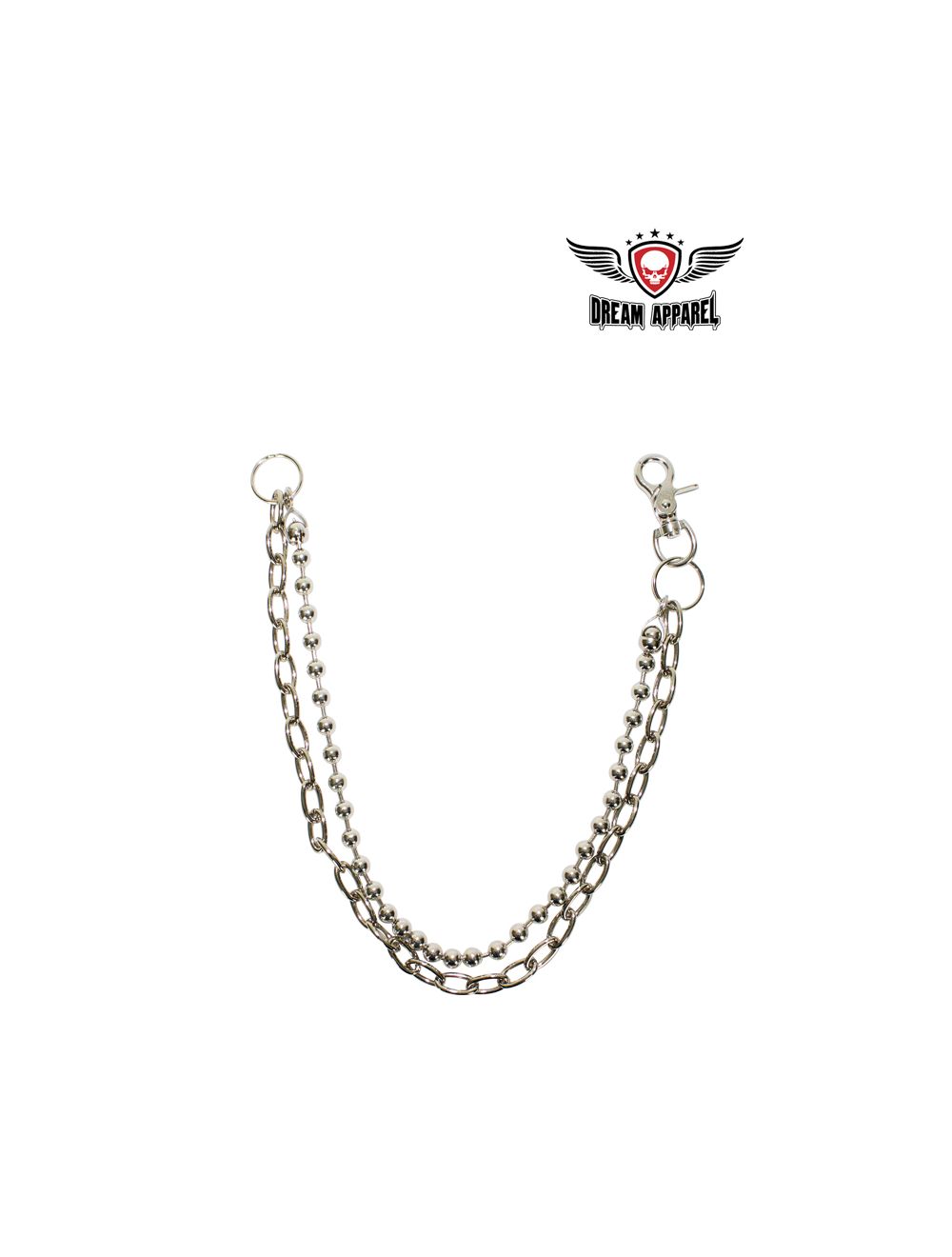 Dream Apparel, the brand the bikers trust and we don't intend to disappoint.We live up to our reputation and we promise to always deliver nbo matter what. This motorcycle chain is infused by a gorgeous chrome material. On one half, oval rings are hooked together while the other side is met with a beaded finish. Both sides are then held together by two heavy duty rings. Easy to attach and remove by a well-made keychain. Measured at 40", this chain is exactly whatevery biker needs. Long, tough and extremely durable.