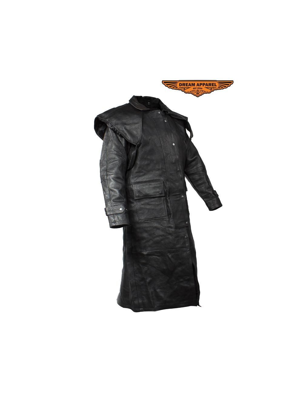 Men Naked Cowhide Duster with Z/o Lining, Leg Straps and Removable Leather Cape